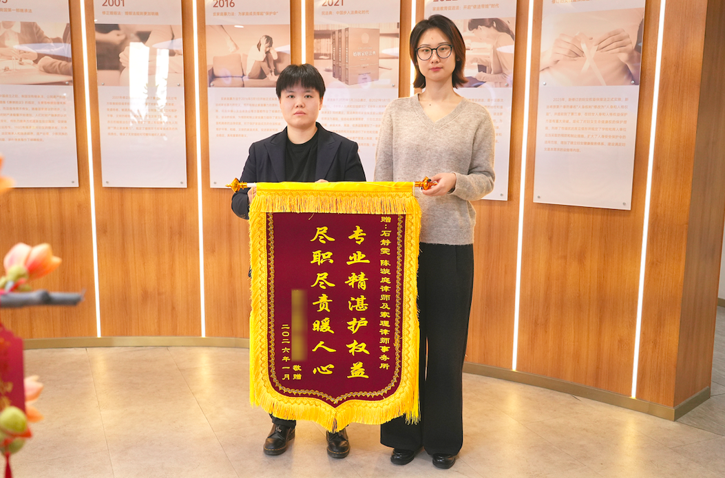近日,北京家理律师事务所资深律师耿艾楠、高级资深律师曹子燕代理的一起法定继承纠纷案件经法院调解圆满结案。凭借专业的法律素养和耐心的沟通协调,耿律师成功促成各方当事人达成调解协议,获得了当事人的高度认可。年过八旬的当事人夫妇在案件结案后专程等候一小时,亲手将锦旗送到耿律师手中,表达诚挚谢意。