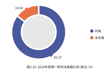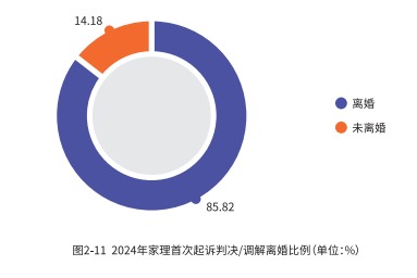 相比之下,在 2024 年家理代理的离婚案件中,一审判决离婚的比例高达85.37%,另外,当事人首次起诉便通过判决或调解的方式解除婚姻关系的比例达到85.82%,这体现出专业律师的介入能够有效帮助当事人提高快速离婚的可能性。