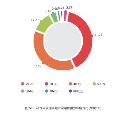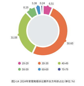 在 2024 年家理代理的离婚诉讼案件中,30-49 岁的人群构成了离婚的主要群体,男方在此年龄区间内离婚的比例高达 79.04%,而女方则为81.68%。这反映了现代社会中个体对婚姻质量的高要求,也揭示了职业压力、社会观念变化以及经济独立性增强等多重因素对婚姻关系的影响。