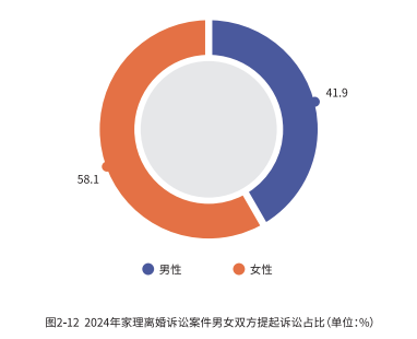 在 2024 年家理代理的离婚诉讼案件中,女性作为原告的比例高达58.1%。女性主动提起离婚诉讼不仅是社会进步的一种表现,也体现了女性在面对婚姻问题时更加主动和理性的态度。