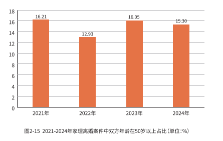 近年来,50 岁以上人群,即所谓的“熟年”群体,在离婚案件中呈现较大的比例,在家理自 2021 年至 2024 年间代理的离婚案件中,熟年离婚这一现象均保持在 10% 以上的比例。