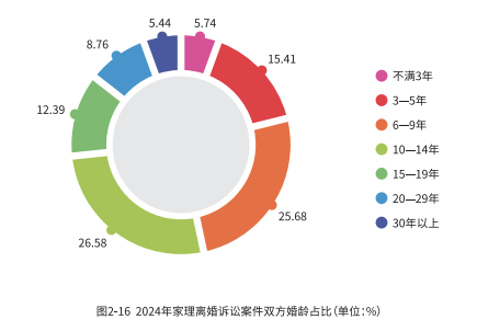2024年家理代理的离婚诉讼案件中,结婚 6-14 年这一时间段是婚姻关系的高危期,占比 52.26%,此阶段内的离婚比例显著高于其他婚龄段。这个阶段往往伴随着一系列复杂的社会经济变化和个人成长经历,这些因素的共同作用下可能会让这段时期的婚姻更容易出现裂痕。