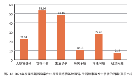 在2024年家理代理的离婚诉讼案件中,有高达74.53%的当事人将离婚归因于“感情基础薄弱、生活琐事”等原因,而在这部分人群中,性格不合则是导致“感情基础薄弱”、因“生活琐事”发生矛盾的最大因素。