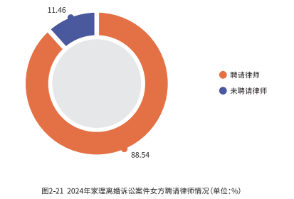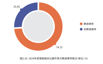 在 2024 年家理代理的离婚诉讼案件中,男方选择聘请律师的比例为 74.15%,女方选择聘请律师的比例为 88.54%,值得注意的是,在这些案件中,双方均聘请律师的比例高达 62.68%。