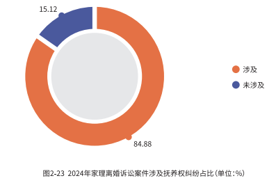 当婚姻关系破裂,夫妻双方选择通过法律途径解决彼此间的分歧时,子女的抚养权往往会成为最敏感且最具争议的问题之一。在 2024 年家理代理的离婚诉讼案件中,涉及抚养权争议的案件比例高达 84.88%。