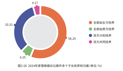 在 2024 年家理代理的离婚诉讼案件中,在处理孩子的抚养权问题时,女方有着明显优势,对于单个子女的抚养权,女方获得抚养权的比例高达77.78%;对于多个子女的抚养权,女方获得全部子女的抚养权占比近六成。