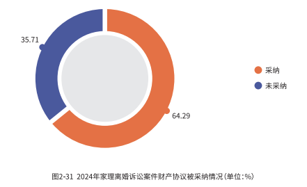 然而在实际操作中,签署财产协议的比例相对较低,仅为 6.9%,且这部分签署过财产协议的案件中,依然有超三成的协议不被采纳,这主要是由于一些协议内容不符合法律规定,或是签订过程存在程序性缺陷所致。