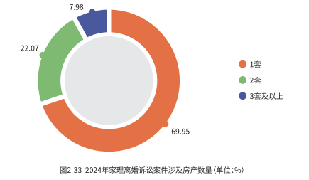 近 7 成(69.95%)的案件中仅涉及一套房产。这表明,在大多数情况下,夫妻双方共同拥有的住宅是他们唯一的不动产,也是家庭财富的主要组成部分。