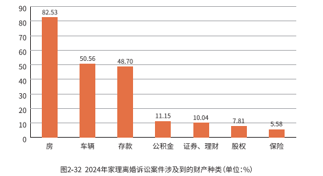 数据显示,涉及财产纠纷的离婚案件中,房产以 82.53% 的比例位居争议财产之首,紧随其后的是车辆(50.56%)和存款(48.7%)。
