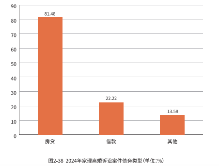 在 2024 年家理代理的离婚诉讼案件中,有 24.1% 的案件涉及到了债务问题,而在涉及到债务问题的这部分案件中,房贷则占据了最高比例(81.48%)。数据说明在大多数情况下,夫妻双方共同承担的住房贷款成为了离婚后债务清偿的重要组成部分。