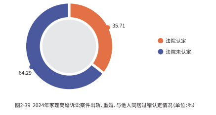 数据显示,涉及出轨、重婚、与他人同居等行为的过错认定情况中,仅有35.71% 的案件得到法院的正式认定,而 64.29% 的案件则未被认定为存在此类过错行为。