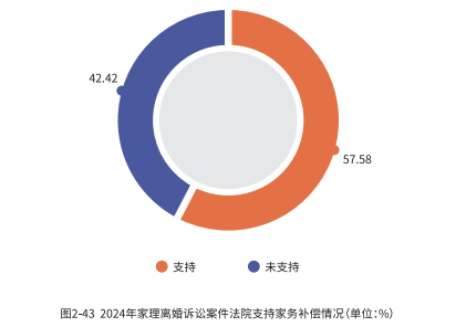在涉及家务补偿主张的案件中,有 57.58% 的请求得到了法院的支持。尽管过半数家务劳动补偿请求获得了支持,但仍有相当一部分未能成功。造成这种情况的原因是多方面的,其中最重要的一点在于证据收集与证明标准的问题。