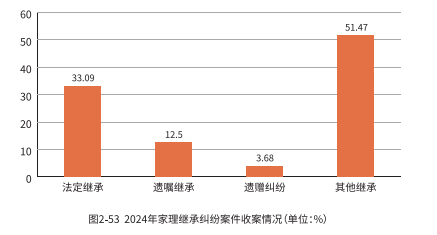 从数据整体表现来看,常见的继承纠纷中,目前法定继承的案件数量及占比仍远高于遗嘱继承。2024 年家理继承纠纷案件中法定继承占 33.09 %。