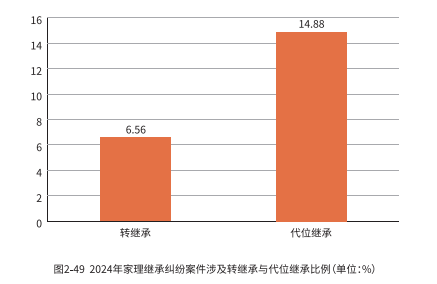 从 2024 年家理继承纠纷案件涉及转继承与代位继承比例的数据来看,代位继承的占比为 14.88%,而转继承的占比为 6.56%。这一数据反映出在当前的继承纠纷案件中,代位继承出现的频率相对较高。