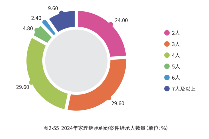 在 2024 年家理代理的继承案件中,遗产继承纠纷多发于 3-4 人之间,其中 3 人继承人占比 29.6%,4 人继承人占比 29.6%。这表明,继承人各方都希望争取到更多的权益,因此更容易诉诸法律途径。