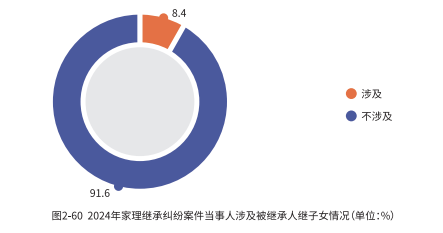在 2024 年家理代理的继承案件中,涉及被继承人家庭重组情况的纠纷占比 62.5%,案件当事人涉及被继承人继子女的纠纷占比 8.4%,可见,重组家庭在继承纠纷中占比明显偏高。