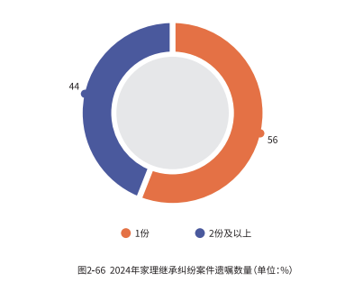 在 2024 年家理办理的涉及遗嘱的继承纠纷案件中,自书遗嘱占比高达 60.87%,远超其他遗嘱类型,这表明自书遗嘱仍是主流遗嘱类型。在遗嘱数量方面,有 56% 的案件存在1份遗嘱,44% 的案件存在 2 份及以上遗嘱。