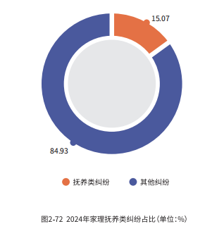 除了离婚纠纷、继承纠纷外,2024年家理还代理了抚养纠纷、赠与合同纠纷、分家析产纠纷、遗赠和遗嘱纠纷以及在婚姻家事案件中的其他各类纠纷。其中,赠 与 合 同 纠 纷 占 比 为 11.87%,抚养类纠纷占比为 15.07%。分 家 析 产 纠 纷 占 比 为 11.42%。