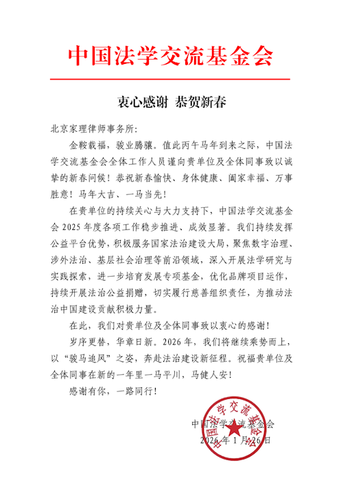 中国法学交流基金会在信中特别向家理律所全体同事致以衷心感谢,并祝愿律所在新的一年里事业腾飞、一马当先,全体同仁身体健康、阖家幸福。