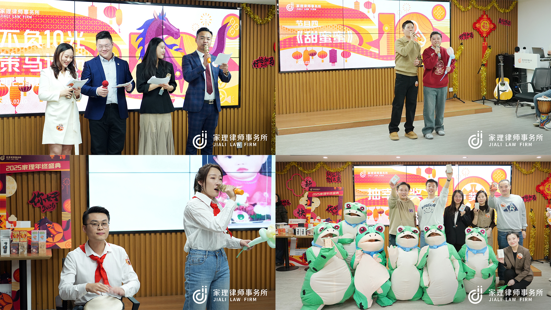 舞台上,卸下“包袱”的领导团队热情开舞,将现场气氛拉向高潮;创意改编的乐队演奏与经典歌曲演唱,勾起无限温暖回忆;活力四射的舞蹈串烧点燃全场热情;妙语连珠、贴近律师工作日常的三句半,以幽默智慧赢得满堂喝彩;而一段搞怪活泼的群“蛙”乱舞,则瞬间引爆笑点——家理人多才多艺、充满活力的风采,在此刻展现得淋漓尽致。