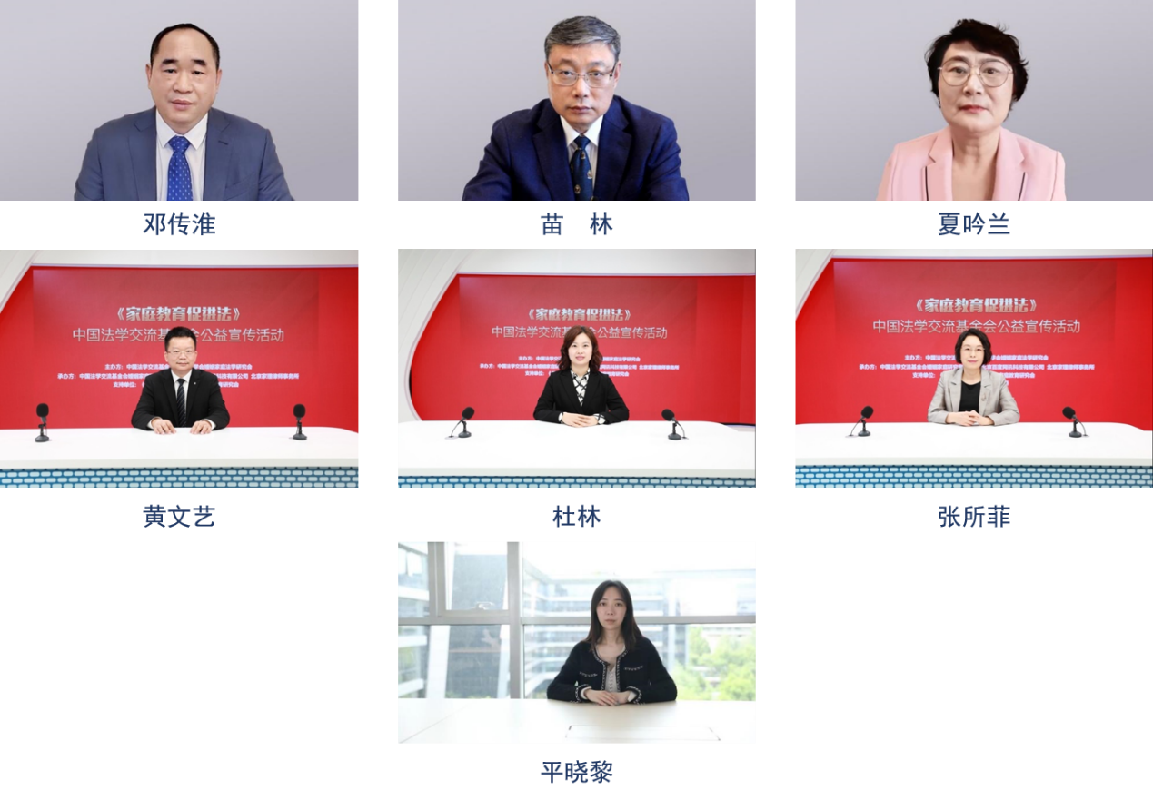 教育部政策法规司司长邓传淮,北京市司法局党委书记、副局长、北京市监狱管理局第一政委苗林,中国法学会婚姻家庭法学研究会会长、中国政法大学二级教授、博士生导师夏吟兰,《中国法学》杂志社总编辑、中国人民大学法学院院长、教授、博士生导师、中国法学交流基金会副理事长黄文艺,《民主与法制》社党委委员、副总编辑、《民主与法制》杂志总编辑、中国法学交流基金会监事长杜林,中国法学交流基金会理事长张所菲,百度副总裁、百度APP总经理平晓黎从不同角度解读了家庭教育促进法。