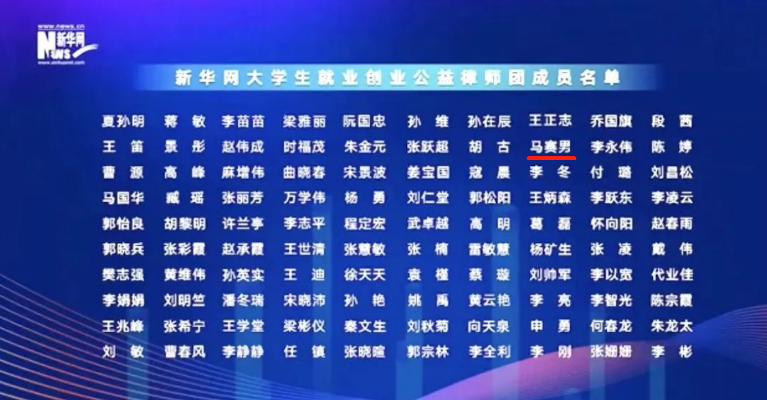 2022年7月15日,由新华网携手多家知名律师事务所共同设立的“新华网大学生就业创业公益律师团”正式成立。会上公布了公益律师团首批成员名单,北京家理(上海)律师事务所主任马赛男律师位列其中。