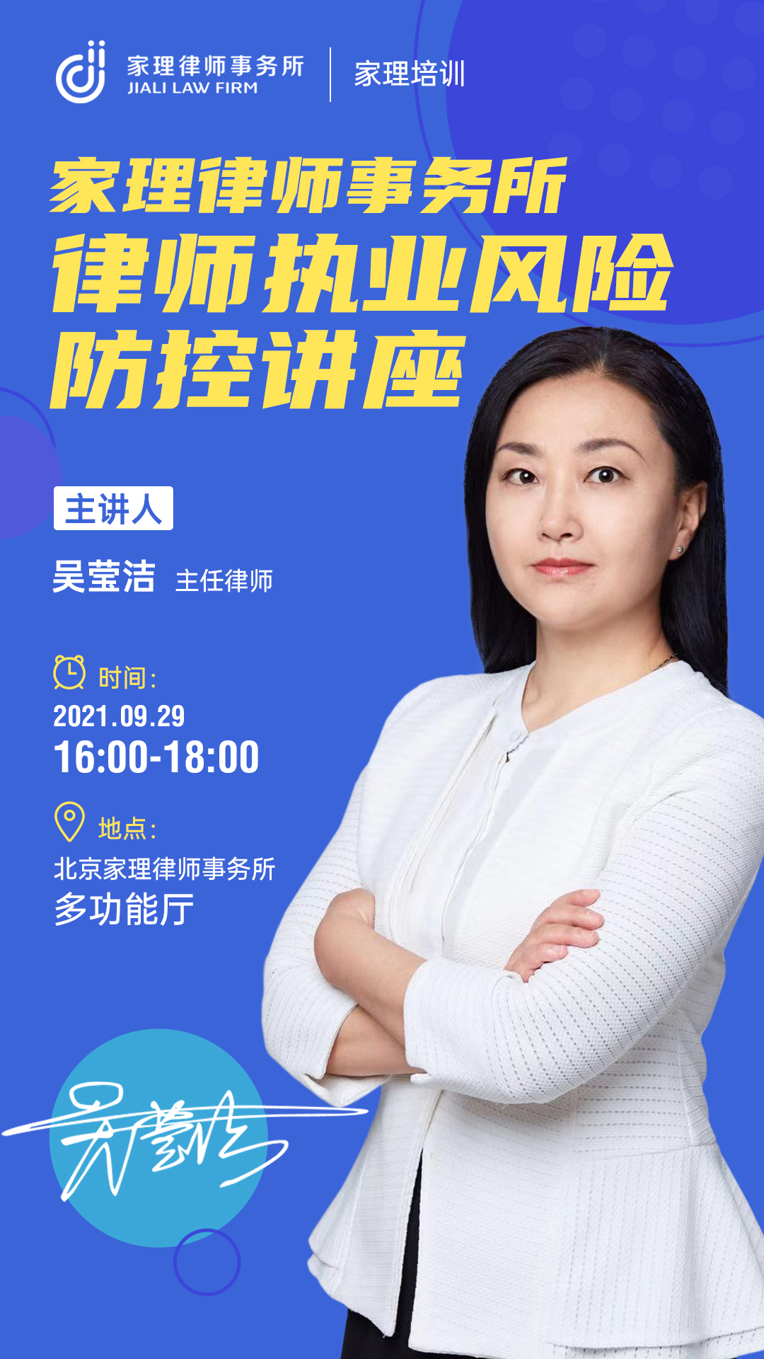 为进一步提升律师在办理案件中的规范化和专业化,增强律师的自我保护和风险防范能力,2021年9月29日下午,北京家理律师事务所在多功能厅开展《家理律师事务所--律师执业风险防控》主题培训活动,本次培训主讲律师为家理主任律师吴莹洁。