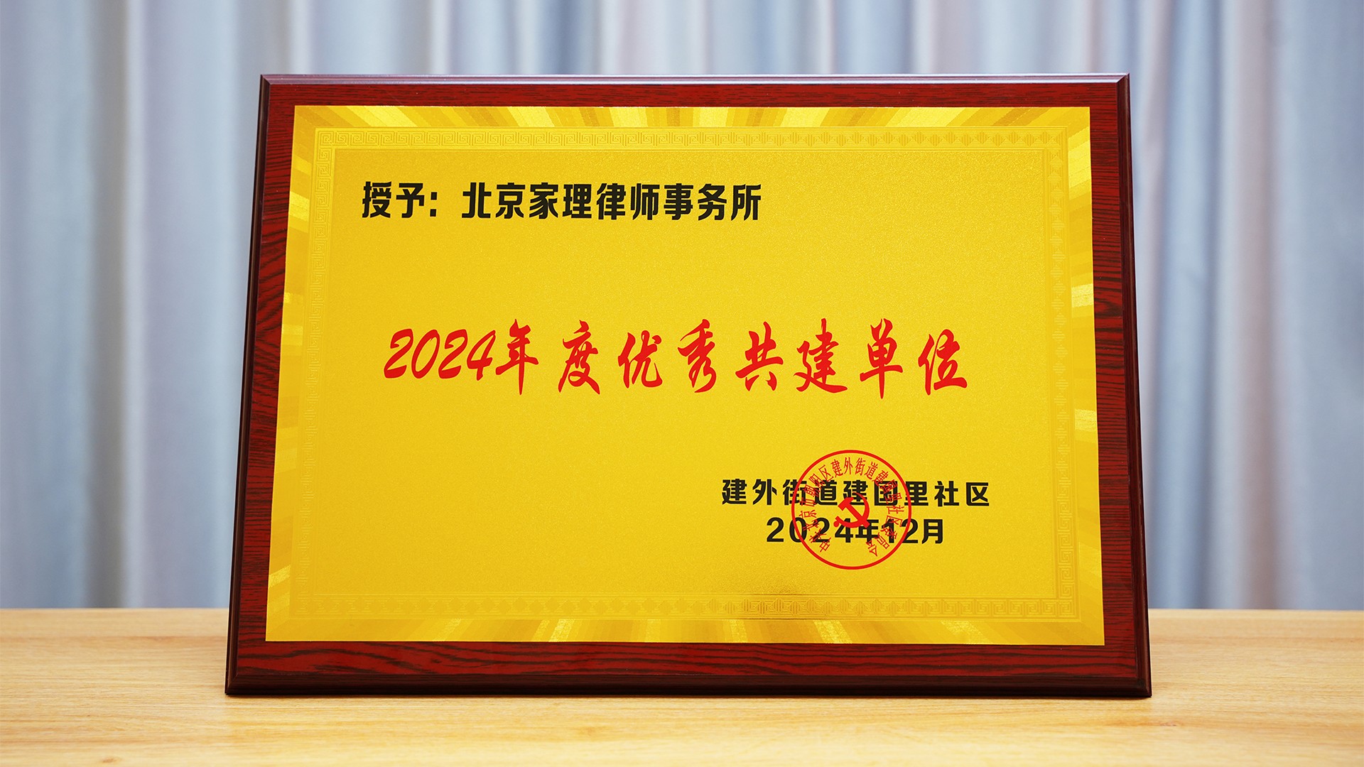 2024年12月13日,建外街道建国里社区共建单位工作总结会圆满举行。家理律师事务所因积极投身社区共建工作,踊跃开展公益普法进社区等活动,成功荣获 2024 年度建外街道建国里社区 “优秀共建单位” 称号。